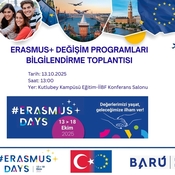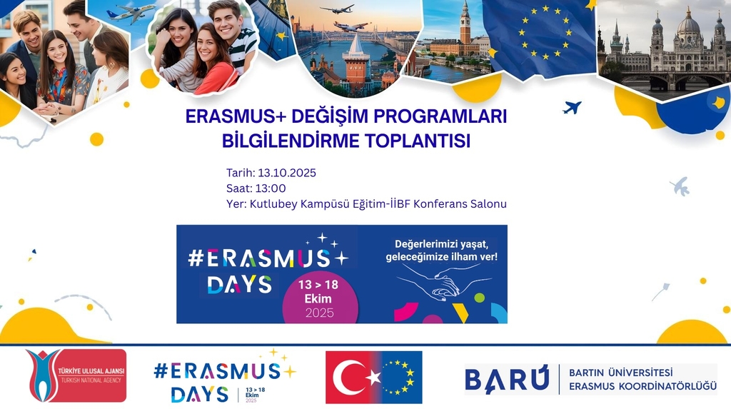 Erasmus+ değişim programları bilglendirme toplantısı 13 Ekim 2025 Pazartesi Günü saat:13:00'te Kutlubey Yerleşkesi Eğitim-İİBF Konferans Salonunda yapılacaktır.